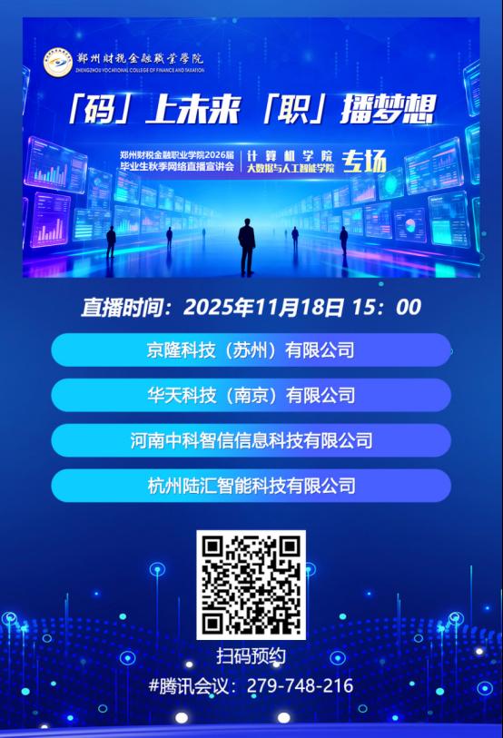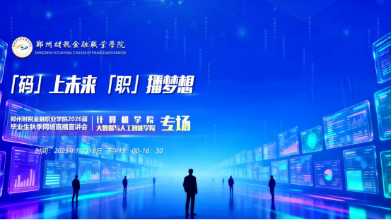 求职季已至,优质offer近在眼前!为帮大家拓宽就业渠道、精准对接心仪企业,郑州财税金融职业学院计算机学院&大数据与人工智能学院联合举办“码上未来 职播梦想”秋季线上专场招聘会,4家优质企业携热门岗位重磅入驻,足不出户就能与HR面对面沟通,快收好这份求职指南~