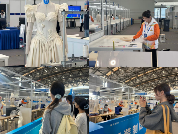 本届大赛设置106个竞赛项目,其中时装技术、服装制版、数字印花等6个赛项与服装专业高度契合。在服装制版赛场,师生见证了选手们从立体裁剪到人台试衣再到安全生产全过程。选手们手持蒸汽熨斗与裁剪刀,在坯布上巧妙勾勒出流畅的曲线,通过“归拔”等手法赋予面料自然张力,将平面布料转化为立体造型,每一处细节都彰显着选手们对工艺的极致追求。