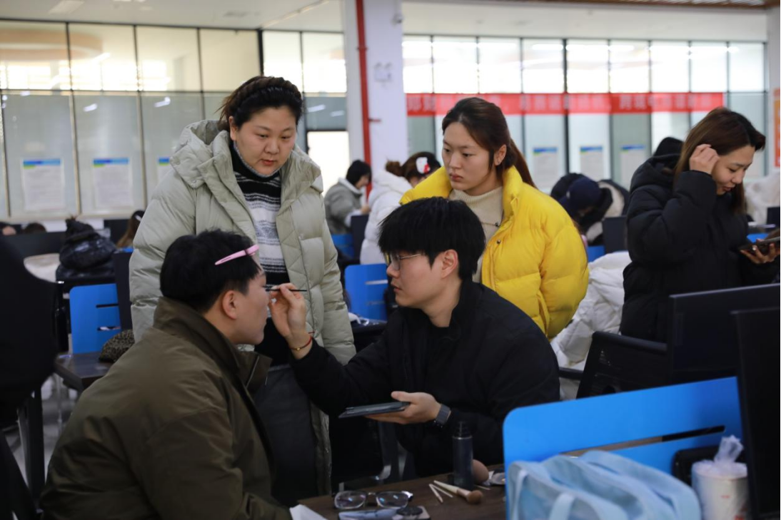 为深入了解学院“课程思政”与专业实践教学的融合成效,闫校长走进人物形象设计专业实践课堂进行现场观摩。该课堂正围绕学校即将举办的思想政治理论课实践教学汇报演出开展实战教学。艺术学院人物形象设计专业24、25级学生全程承担了汇演所有演员的化妆造型设计任务,在真实项目中综合运用专业所学。
