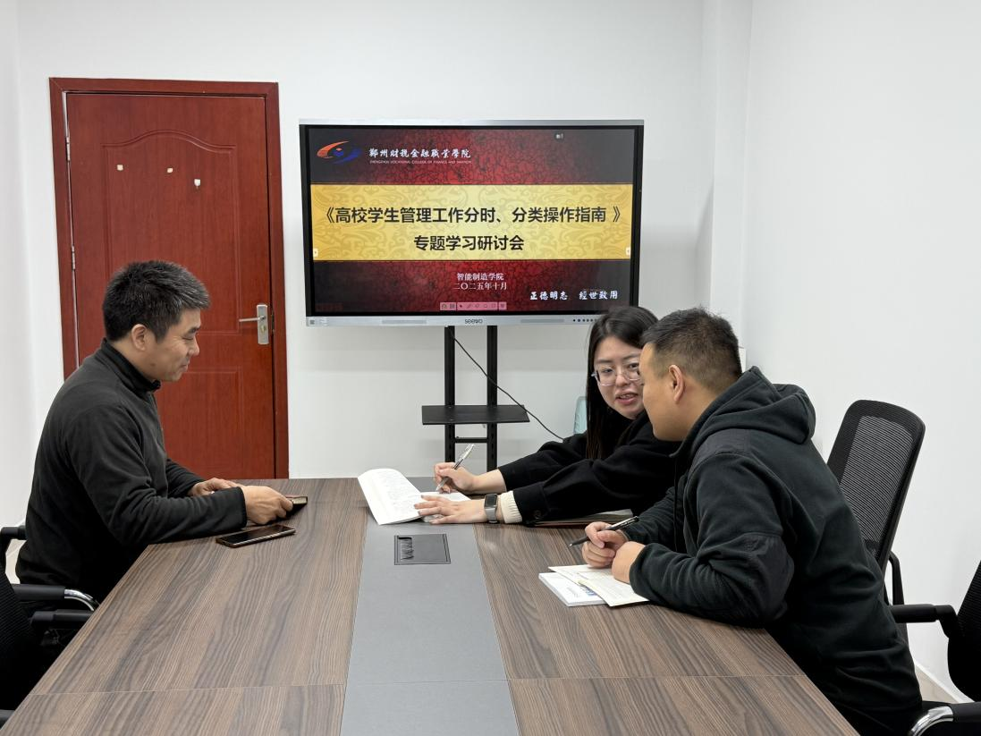 为深入贯彻落实立德树人根本任务,进一步提升学生管理工作的规范化、精准化与科学化水平,近日,智能制造学院组织开展了《河南省本科高校学生管理工作分时、分类操作指南》专题学习研讨会。