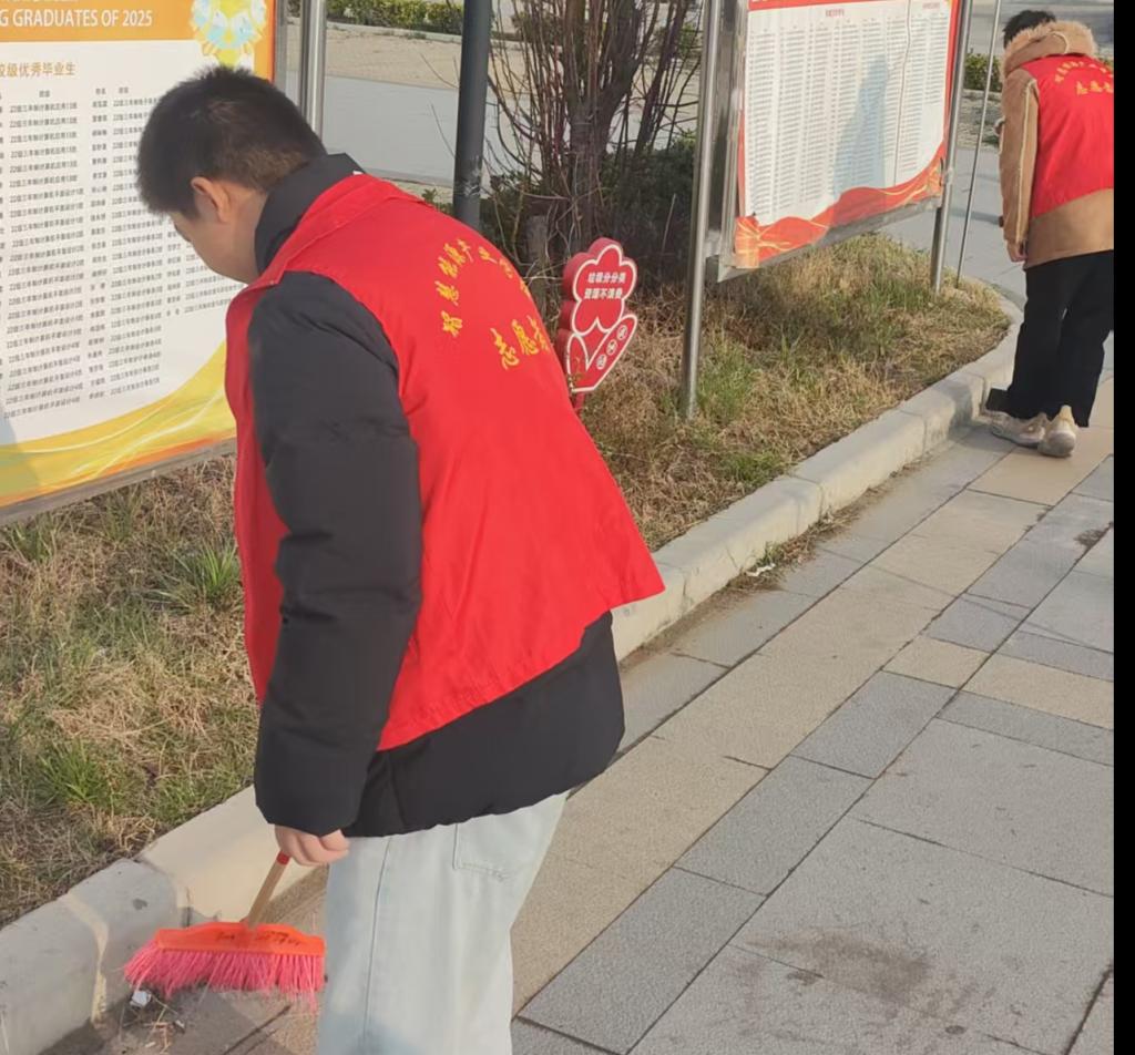 活动当天,志愿者们精神饱满,分组前往校园主干道、教学楼周边、操场看台及绿化带等重点区域展开清扫。面对路面散落的纸屑、塑料袋以及隐藏在草丛中的枯枝落叶,大家手持清扫工具,发扬不怕脏、不怕累的精神,从细微处入手,对校园环境进行了全面彻底的清理。在做好卫生清扫的同时,志愿者们还将“文明行为引导”贯穿始终。他们以身作则,用行动感染身边同学,对不文明行为耐心劝导,对乱扔垃圾现象及时制止,以劳动为校园增添洁净与文明亮色。